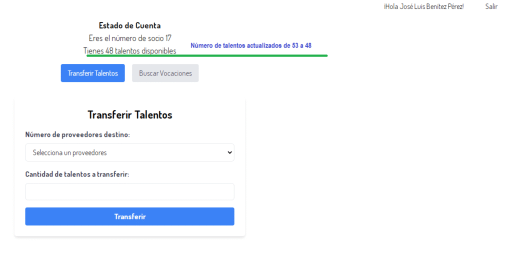 Selecciona el numero de socio y los talentos a transferir
