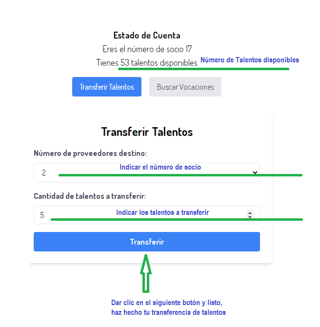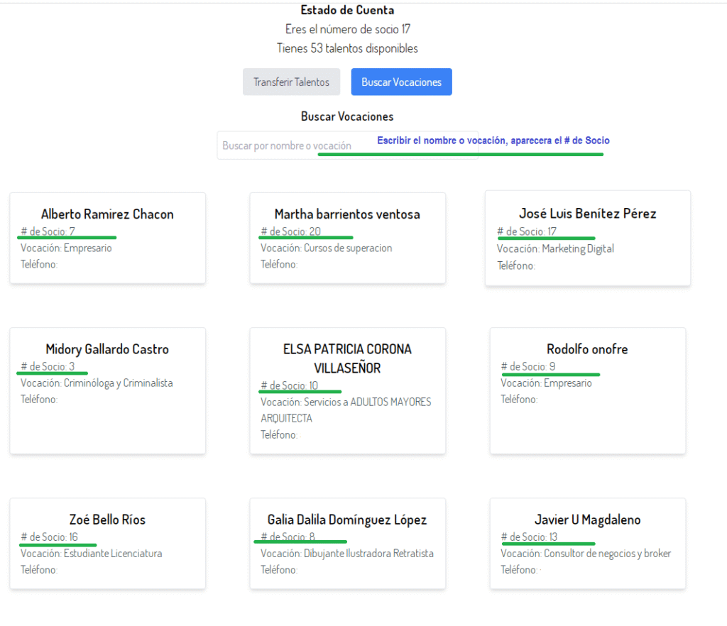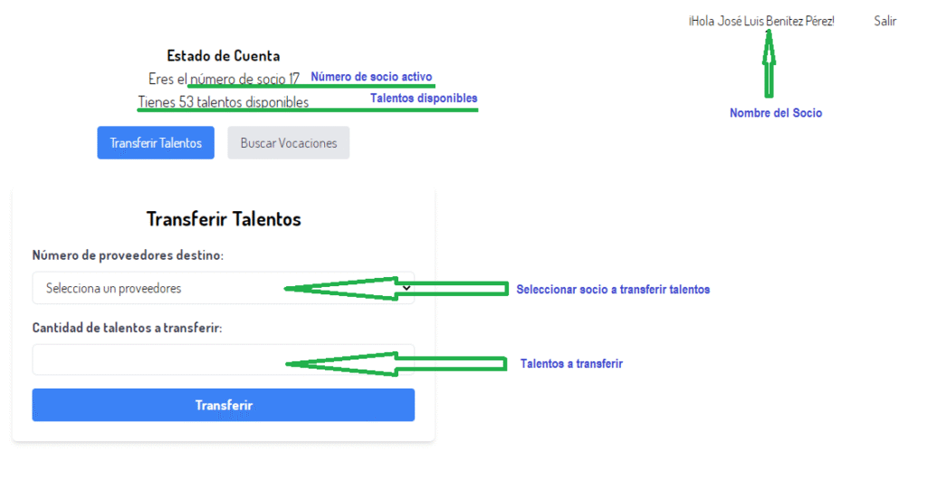 Al registrarte, recibirás tu número de socio, el cual es muy importante, ya que será necesario para transferir y recibir talentos.